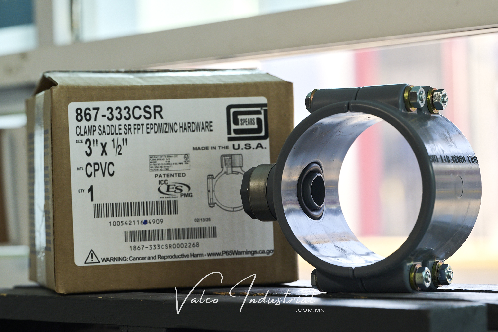 Clamp-On Saddle x SR Thread Single Outlet PVC Gray with EPDM O-ring Seal & Zinc-Plated Hardware. 2″- 4″ 235, 6″ 200, 8″-12″ 150 psi @ 73°F (23°C) Spears® Manufacturing Company.